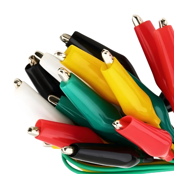 This set of 10 Double Sided Alligator Clips is an essential tool for electronics prototyping, testing, and DIY projects. Each clip is connected at both ends to insulated wires, allowing quick and secure temporary connections between electronic components, wires, breadboards, and test equipment. Designed with color-coded insulated covers for safety, these clips prevent accidental shorts and provide reliable contact during electrical testing and circuit assembling.
